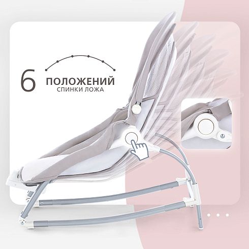 Особенностью этого шезлонга является наличие 2-х способов укачивания: родители могут запустить виброукачивание или воспользоваться традиционным качанием на дугообразных ножках. На концах дуг находятся специальные фиксаторы, благодаря которым шезлонг можно перевести в неподвижное положение. Виброукачивание и проигрывание мелодий запускается при помощи кнопок на вибро-музыкальном блоке. В памяти устройства находится несколько музыкальных композиций и предусмотрена регулировка громкости звучания.