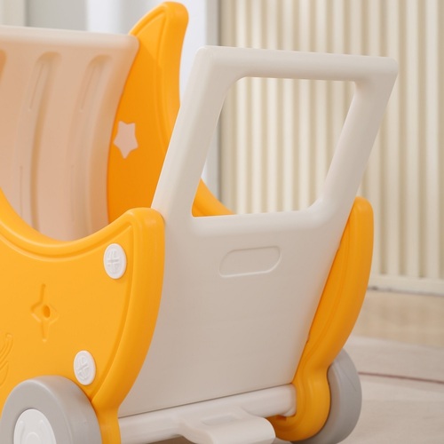 Яркая и прочная коляска для игрушек Unix Kids Moon не оставит равнодушным вашего ребенка. Подходит для использования на улице и дома. Желтый цвет выбран не случайно — он заряжает оптимизмом! Яркий цвет и необычная форма будут радовать малыша. Прекрасно вписывается в интерьер и позволяет ребенку проявлять заботу к своим игрушкам, беря их с собой в маленькие путешествия. Коляска для кукол изготовлена из пищевого пластика, что делает ее безопасной в использовании.