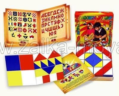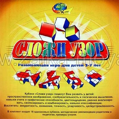 Игра состоит из 16 кубиков, грани которых окрашены в четыре цвета (красный, желтый, синий, белый) определенным образом. С помощью этой игры можно развить у ребенка пространственное воображение, аккуратность, внимание, графические способности, а также умение анализировать, синтезировать, комбинировать.