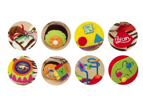 Содержит 28 активных элементов, среди которых есть погремушки, шуршалки, трещалки, пищалки, кармашки с прячущимися в них предметами;