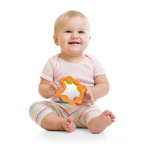 На корпусе каталки есть вращающиеся элементы и бубен с зеркальцем, бубен снимается, удобно держать его за ручку. Если бубен потрясти, он будет издавать звук.