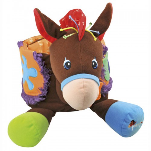 Мягкая лошадка сшита из материалов с разной фактурой, на голове у нее присутствуют забавные ниточки с узелками, а на седле - бахрома. К шее игрушки крепится фигурный прорезыватель.