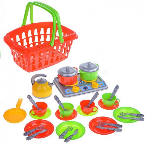Комплектация: 1 корзинка; 4 набора посуды; 2 кастрюли; 1 сковородка; 3 крышки; 1 чайник; 1 плита;