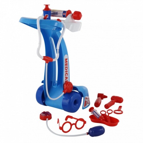 - На тележке есть специальные выемки и отсеки для хранения медицинских инструментов: шприц для уколов, ванночка, ножницы, стаканчик с крышкой, лупа, молоточек для проверки рефлексов, инструмент врача-отоларинголога, фонендоскоп и даже очки, как у доктора Айболита.