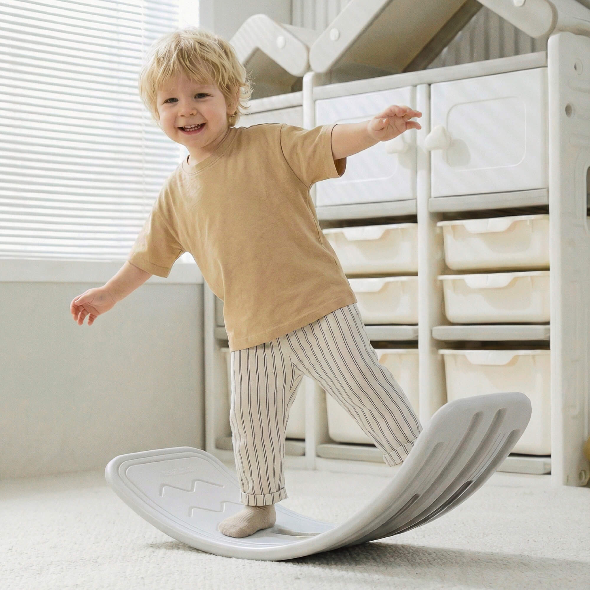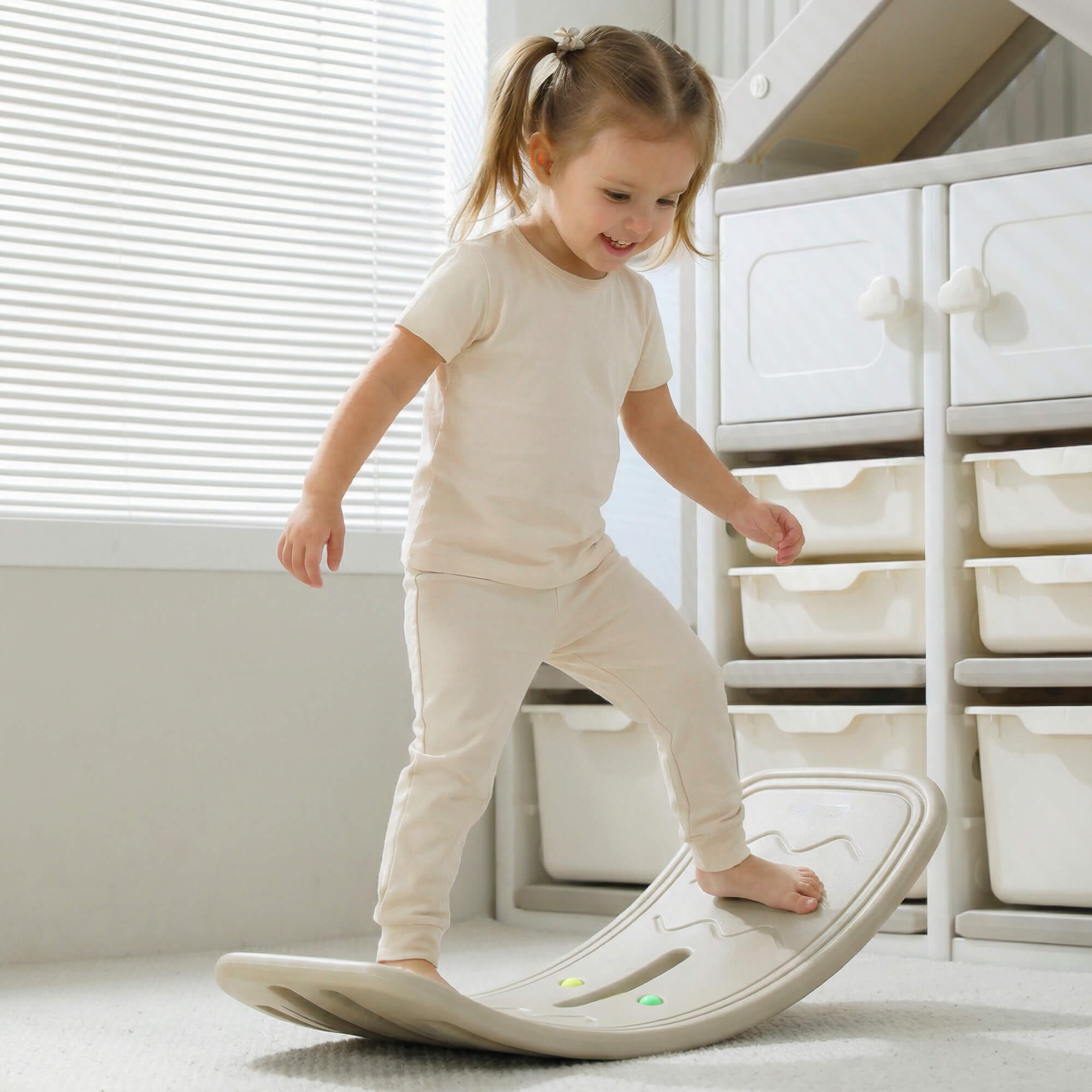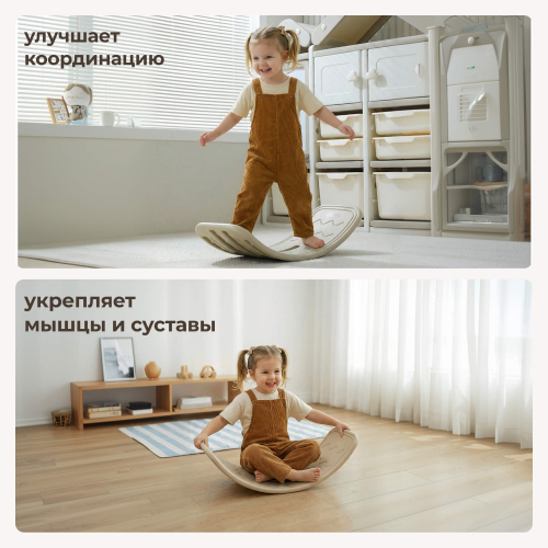 Балансировочная платформа способствует эффективному укреплению мышц ног, улучшению чувства равновесия и общей координации движений. Эргономичный дизайн изделия обеспечивает безопасность тренировок даже малышам, позволяя избежать травм и падений благодаря надежным противоскользящим накладкам.