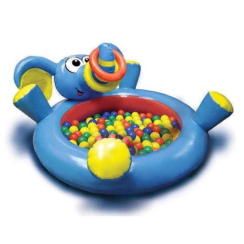 Надувной бассейн включает 20 разноцветных шаров и 2 надувных кольца, которые могут быть наброшены слону на хобот.