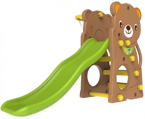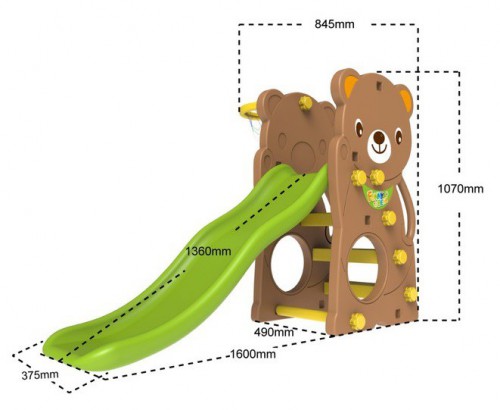 - Горка имеет волнистый скат, который замедляет скорость движения малыша во время спуска с нее, и сделана из прочного пластика салатового цвета. Она располагается между двумя фигурами бурых медвежат, между которыми также находятся ступени и поручни, позволяющие забраться на горку для дальнейшего спуска вниз