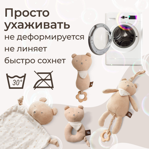 - Материал: гипоаллергенный хлопок, мягкий наполнитель, прорезыватель из бамбука
