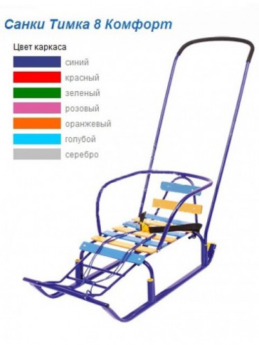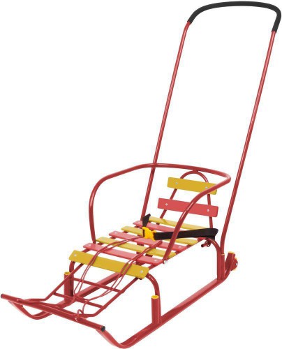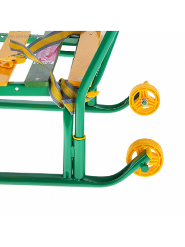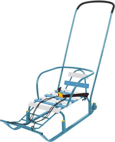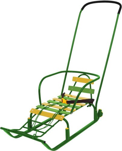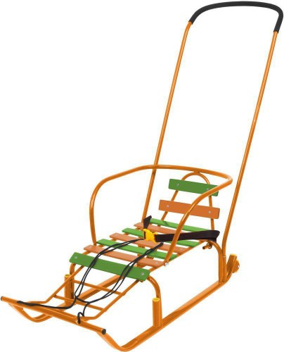 Особенности: удлинённая база, спинка с поперечными деревянными рейками, перекидная ручка, пластиковые вкладыши под ручку-толкатель, плоские полозья и колеса, которые облегчают транспортировку санок, подножка, ремень безопасности.