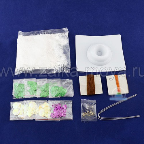 Комплектация: бисер желтого цвета, пайетки желтые (63 штуки), пайетки фиолетовые (43 штуки), пайетки зеленые (108 штук), пряжа, проволока, каркас для ствола, гипс, пластиковая форма для подставки, подробная инструкция