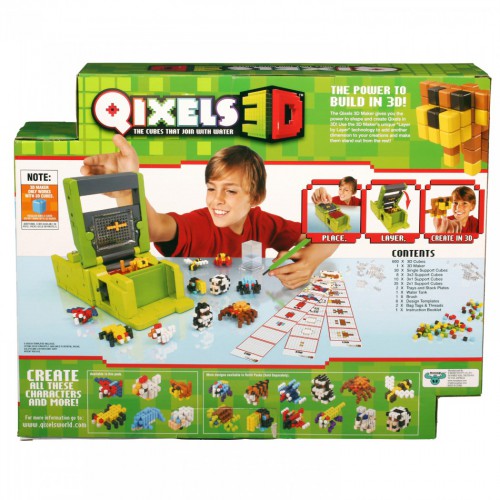 Творческий процесс выглядит так: необходимо выбрать лекала из имеющихся в комплекте или придумать свой собственный проект. Затем открыть крышку 3D принтера Qixels и на нижнюю часть устройства (силиконовую пластинку) нанести кисточкой слой воды, а верхнюю сторону покрыть кубиками. Только нужно быть очень внимательным, ведь для первого уровня-фундамента стоит использовать лишь специальные крупные пластины, а вот уже дальше выстраивать задуманную фигурку можно из одиночных кубиков. Устанавливая каждый новый "этаж" на верхнюю часть, нужно не забывать о смачивании водой. После этого, нижняя и верхняя стороны 3D принтера Квикселс совмещаются и слегка сдавливаются, как будто это пресс. Подобная последовательность действий - залог того, что готовая фигурка будет прочной, надежной и не сломается во время игры. После окончания работы нужно обязательно дать высохнуть смоченной водой фигурке.
