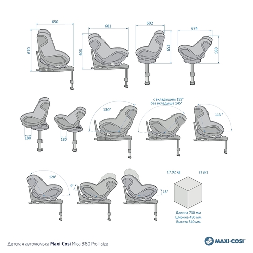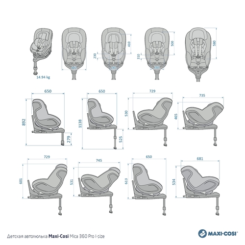 Maxi-Cosi Mica 360 Pro i-size рассчитано для ребенка с рождения от 40 см до 105 см и весом до 18 кг. Автокресло соответствует самому новому и жесткому стандарту безопасности i-Size. Это не только проверка на стандартные тесты, но и проверка боковой защиты, а так же увеличенные размеры сидения, чтобы максимально долго возить ребенка против хода движения ( что научно доказано, самое безопасное положение ребенка до 4 лет). Интегрированная в корпус кресла дополнительная боковая защита G-CELL 2.0 обеспечивает высокий уровень защиты, что подтверждают результаты краш-тестов немецкого клуба автолюбителей ADAC и австрийского клуба OAMTC.