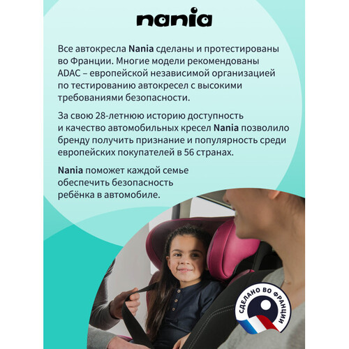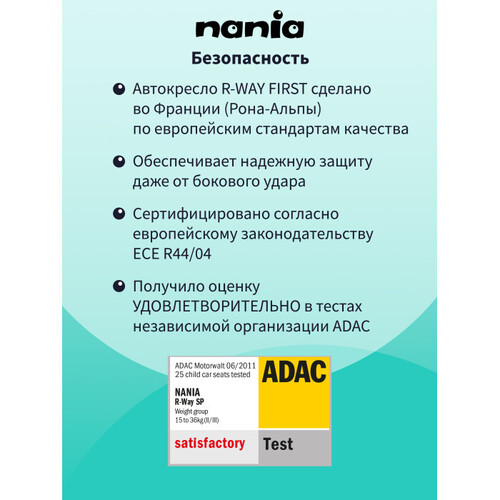 Автокресло Nania Rway First 15-36 кг легкое и простое в установке. Ребенок пристегивается непосредственно штатным ремнем безопасности. Подголовник регулируется по высоте в нескольких положениях. Для большего удобства подлокотники можно поднять или опустить в стандартное положение. Автокресло RWAY имеет защиту от бокового удара.