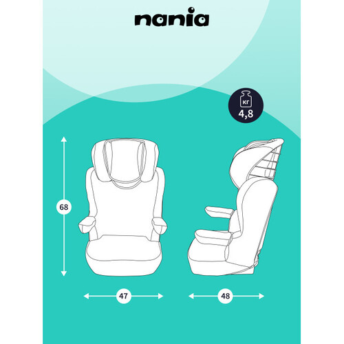 Автокресло Nania Rway First 15-36 кг относится к группе 2/3 и подходит для детей от 15 до 36 кг, то есть от 5 до 10 лет.