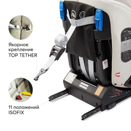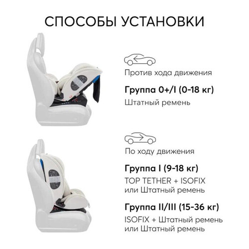 Установка по ходу движения возможна с помощью системы изофикс + якорный ремень или с помощью штатного автомобильного ремня (для ребенка от 9 до 36 кг).