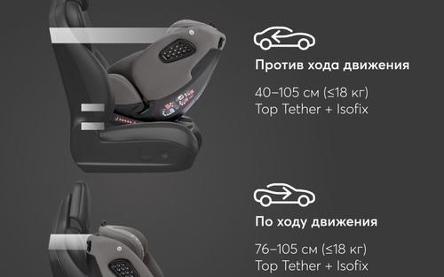 - 2 возможных варианта крепления в машине: Изофикс + якорный ремень или штатные - трехточечные - ремни безопасности. ISOFIX практически на 100% исключает неправильную установку автокресла в машине. Чтобы надежно закрепить Юникс вам достаточно будет вставить шасси кресла в Isofix разъемы своего авто и протолкнуть до щелчка. Якорный ремень Top Tether создает дополнительную третью точку крепления, сильно снижая нагрузку на область шеи головы в момент удара. 3-точечные ремни используются начиная с 4 летнего возраста ребенка.