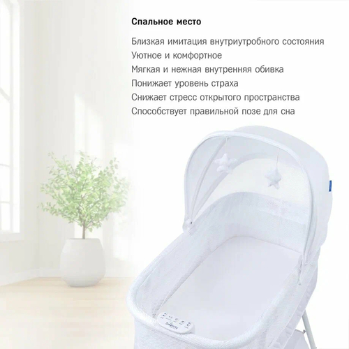 За электронное укачивание отвечает бесшумная система магнитного качания Simplicity Auto Gliding на воздушных подушках, которая работает посредством адаптера от электрической сети и не требует установки батареек. При включении происходит возвратно-поступательное взаимодействие магнитов и образуется «магнитная подушка» от которой бесшумно "скользит" спальное ложе и новорожденный плавно укачивается, как на «маминых ручках».