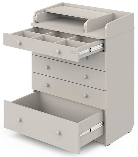 Верхний ящик поделен на множество ячеек, что позволит небольшие детские вещи, косметику, соски и пустышки, разместить максимально удобно. Нижний ящик идеально подойдет для больших, объемных вещей, как комбинезоны, конверты, постельное белье и бортики.