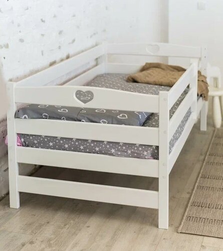 Верхние планки на бортиках кровати фигурные с вырезанным сердечком по центру, что придает данной модели определенную эстетическую красоту. Кровать выполнена из древесины отборных сортов. Покрытие - эмаль на водной основе.