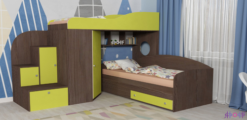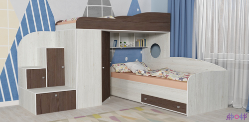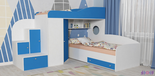 Кровать чердак Ярофф Кадет 2Идеальная модель для тех, у кого двое детей. Эта мебель представляет собой два спальных места. Верхнее сальное место имеет размеры 80*190 см. Волнообразный борт служит защитой, его высота в разных местах – 200 – 350 мм. Нижнее спальное место имеет размеры 90*200 см. Внизу имеется выдвигающийся ящик. Между ярусами имеется книжная полка. Она поделена на три секции. Оригинальная лестница в виде трех тумбочек разных размеров, является дополнением к кроваткам. В ящики можно складывать все что угодно.