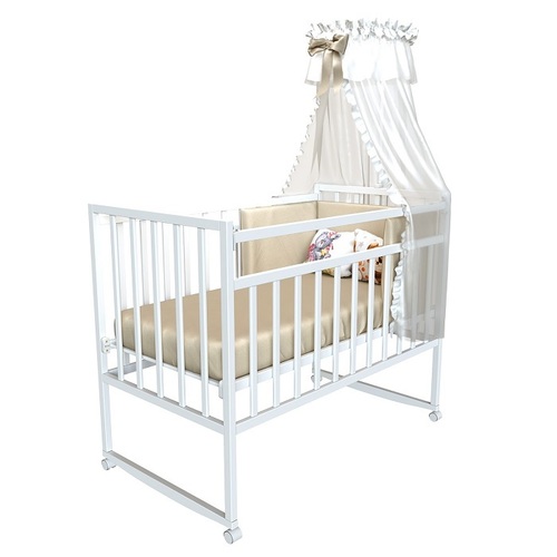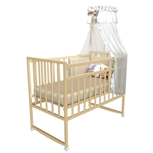Кроватка выполнена из березы, которая по праву считается лучшим сырьем для первой детской мебели. Дно кроватки имеет два уровня фиксации: на верхний укладывают новорождённого, а вниз опускают, как только малыш начинает пробовать садится, чтобы исключить неприятные сюрпризы и падения. Планка фронтальной боковины удобно опускается вниз практически на 20 сантиметров, что облегчает доступ к ребенку.