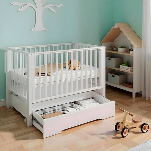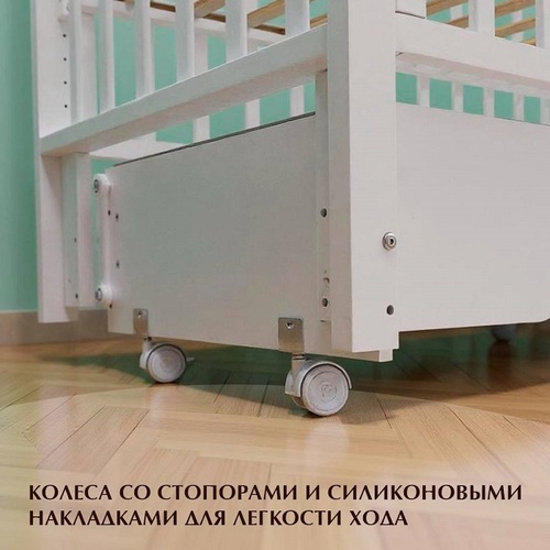 Благодаря колесам, которые не портят напольное покрытие, кроватку легко перемещать по комнате. Большой закрытый ящик позволит рационально использовать место под кроваткой. Ящик полностью закрыт от пыли и оснащен доводчиками, которые сделают открытие и закрытие ящика более плавным и тихим, а также позволят выдерживать большие нагрузки.