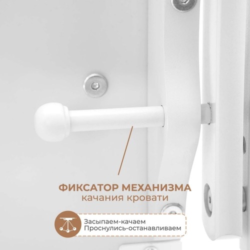 У кроватки Woodix Colibri Go лаконичный дизайн, поэтому её можно купить в детскую с любым интерьером (классическим, минималистичным, сканди, прованс, сказочным или другими). Модель имеет универсальный маятниковый механизм из массива дерева, который работает надёжно и бесшумно, а при необходимости фиксируется. В зависимости от предпочтений младенца – вы сможете баюкать его в поперечном (из стороны в сторону) или продольном (вдоль тела) направлении. Также для удобства в модели Woodix Colibri Go присутствуют колеса для удобного перемещения.