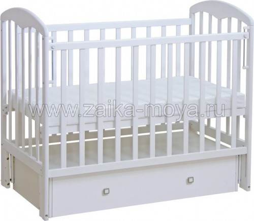 Детская кроватка с глубоким закрытым выдвижным ящиком для белья и универсальным маятниковым механизмом (поперечное или продольное качание). Стенка опускается одной рукой, механизм "кнопка". Изготовлена из массива березы, обработана нетоксичным, безопасным для малыша, бесцветным лаком.