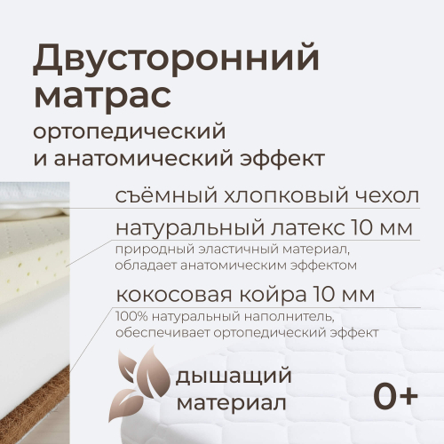 В комплекте с кроватью на колесиках идет двусторонний матрас средней жесткости, обеспечивающий правильную поддержку позвоночника малыша. Натуральный состав наполнителей (латекс и кокосовая койра толщиной 12 мм каждый слой) гарантирует экологичность и гипоаллергенность. Съемный чехол выполнен из хлопка.