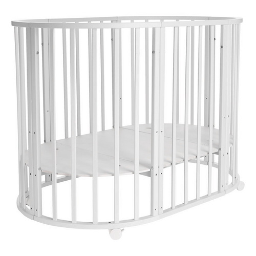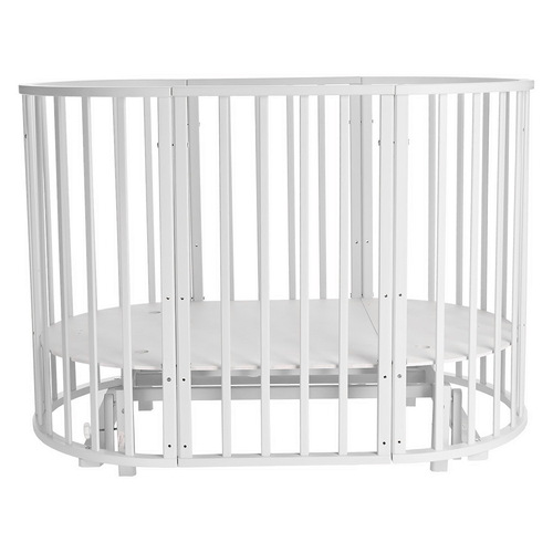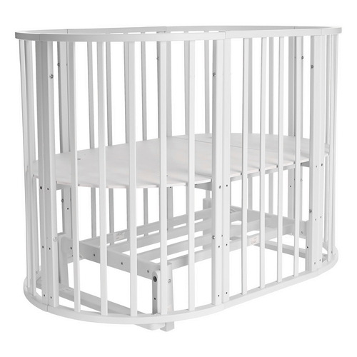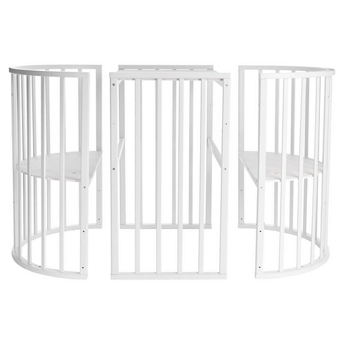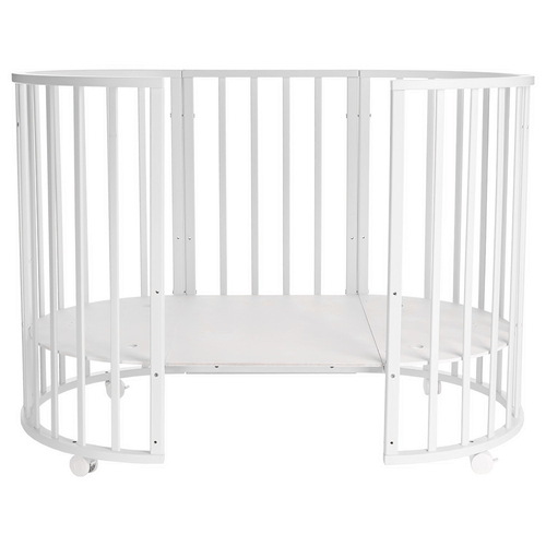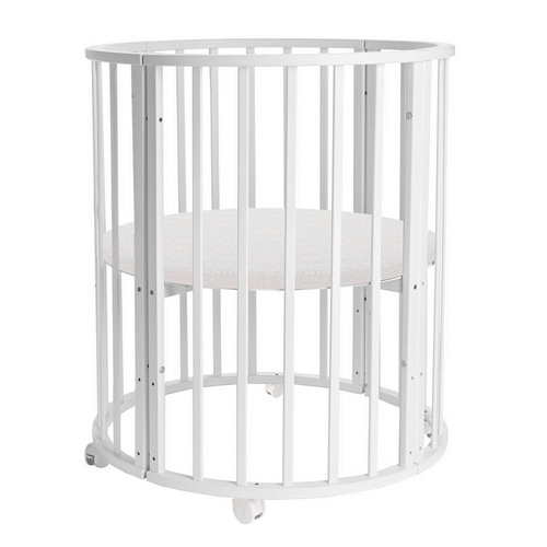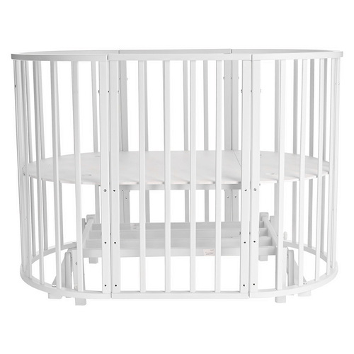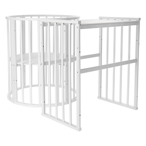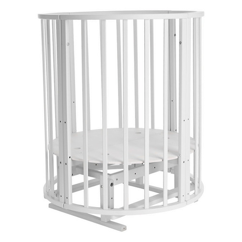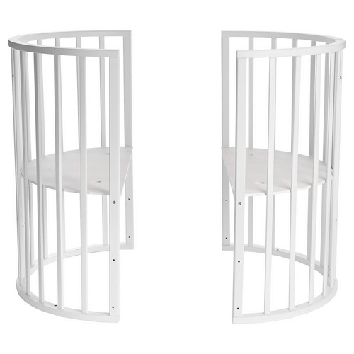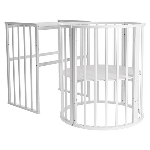 Кровать в зависимости от возраста ребенка может быть собрана в виде круглой колыбельки на колесах или с маятником. Такая "колыбелька" идеально подойдет для новорожденного ребенка. Небольшие размеры кроватки помогут ребенку чувствовать себя более спокойно и комфортно и не боятся большого пространства. Вместе с круглой кроваткой можно собрать пеленальный столик с одной полочкой.