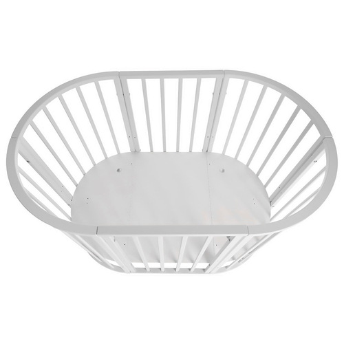 Для ребенка от 4-6 месяцев колыбелька + столик собираются в большую овальную кровать. Она так же может быть установлена на колеса или на маятник. В этом модели уже предусмотрено большое спальное место 120х60 см. Когда ребенок подрастет передний бортик можно полностью снять и превратить кроватку в диванчик. При этом закругленные боковины кровати дадут ребенку безопасность во время ночного сна.