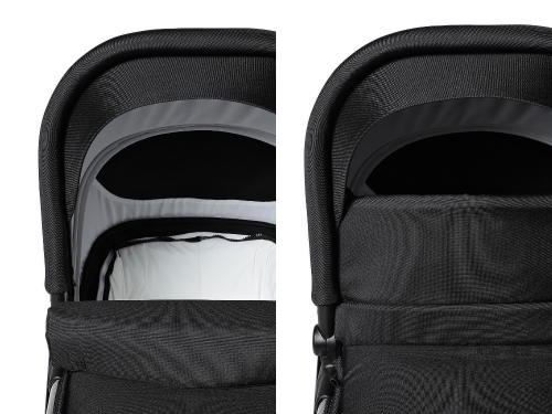 - В одном из отсеков капора вы найдете окошко с москитной сеткой для наблюдения за крохой, прикрытое тканевым клапаном на магнитном замке