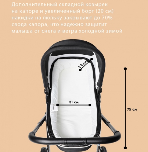 - Дополнительный складной козырек на капоре и увеличенный борт (20 см) накидки на люльку закрывают до 70% свода капора, что надежно защитит малыша от снега и ветра холодной зимой,