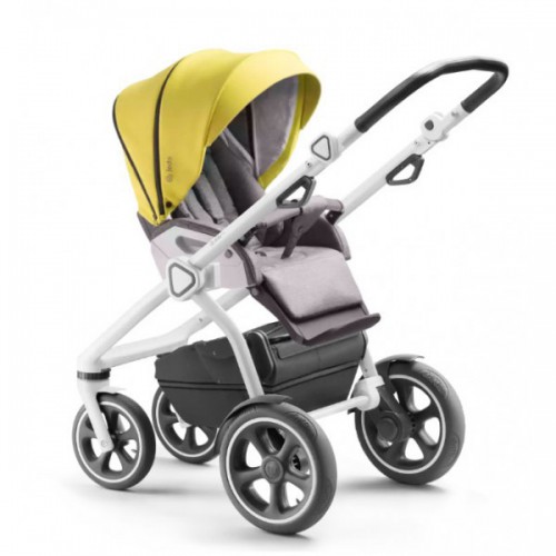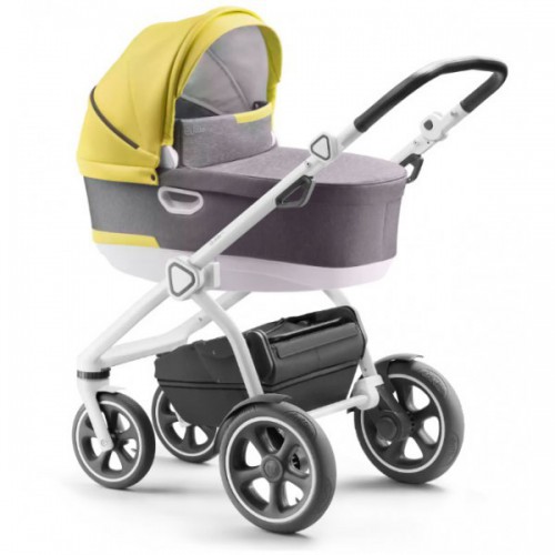На шасси коляски 2 в 1 Jedo Trim установлены 4 надувных колеса, передние из которых – поворотные. При необходимости (езде по плохому дорожному покрытию) их можно зафиксировать. Люльку можно устанавливать в обоих направлениях.
