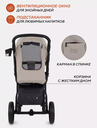 Объёмный карман в капюшоне позволяет хранить телефон, кошелёк и ключи. Коляска идеально подходит для родителей среднего и высокого роста, но благодаря регулируемой ручке, модель подойдёт и невысоким мамам и папам. В объёмную корзину с жёстким дном помещаются игрушки и покупки.