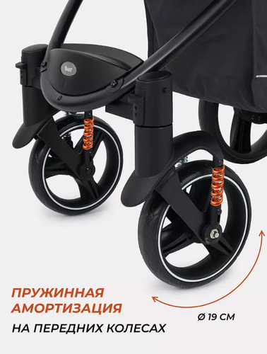 Коляска оснащена пружинной амортизацией на передних колёсах, что обеспечивает мягкость хода и позволяет ребёнку не чувствовать даже серьёзные препятствия на дороге.