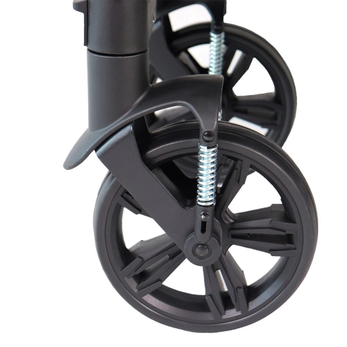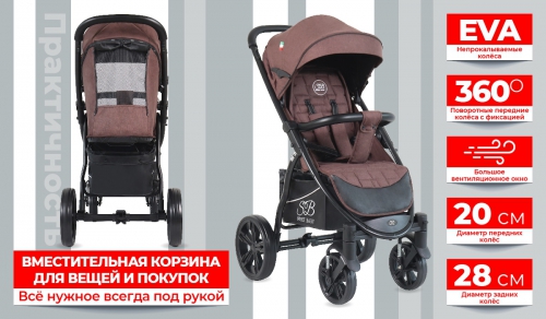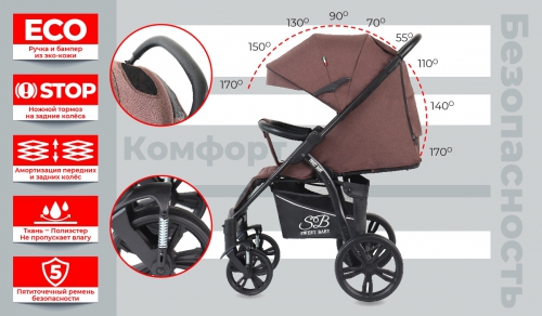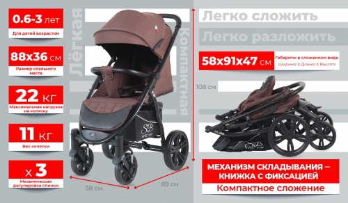 Отличительной особенностью данной модели является большое комфортное спальное место с горизонтальным положением спинки. Ребенок сможет комфортно спать на улице по несколько часов. Спинка удобно регулируется с помощь рычага в строго фиксированных положениях. Регулировка спинки происходит одной рукой, плавно, чтобы не потревожить ребенка. Компактная система складывания коляски вместе с сиденьем, при которой рама занимает устойчивую вертикальную позицию, надежно фиксируется держателем, сохраняется гигиеничность ручки и текстильной обивки. Большие задние колеса легко преодолевают неровности грунта и препятствия загородных дорог, передние позволяют маневрировать в сложных городских условиях и являются полноповоротными, что значительно облегчает управление коляской. Функция блокировки передних колес удобна при передвижении по снегу и грязи