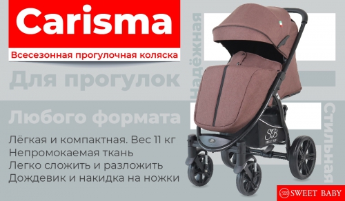 Прогулочная коляска Sweet Baby Carisma (Свит беби Карисма) всесезонная прогулочная коляска из инновационных материалов с повышенной износостойкостью и устойчивых к выцветанию. В любое время года коляска обеспечит ребенку комфорт и безопасность. В холодное время года коляска защитит ребенка от непогоды, а теплая накидка на ножки сохранит тепло внутри коляски. В теплое время года коляска отлично проветривается за счет большого вентиляционного окошка в задней части капюшона, а глубокий капюшон надежно укроет от солнца.