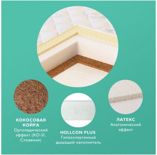 Жесткий и прочный наполнитель из переплетенных волокон кокосового ореха, скрепленных латексом – вспененным соком каучукового дерева. На 100% натуральный материал, экологически чистый и долговечный, один из лучших, которые может предложить нам природа. Обладает исключительными антиаллергическими и антибактериальными свойствами: не впитывает запахи и влагу, не гниет, отлично пропускает воздух и регулирует температуру, к тому же не деформируется. А самое главное – идеально поддерживает позвоночник маленького ребенка во время сна. По мнению ортопедов и педиатров, идеальный наполнитель матрасов для новорожденных.