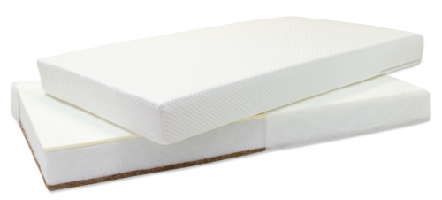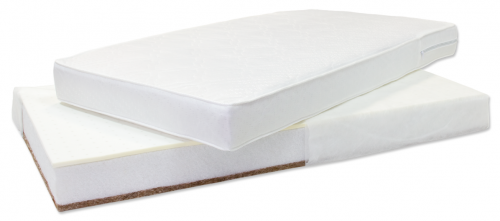 - из беспружинных – оптимальный матрас за свою цену, благодаря разным свойствам сторон сочетает преимущества и кокоса — как более твердого для первых месяцев сна малыша, так и латекса – более комфортного для сна в возрасте от 6 месяцев;