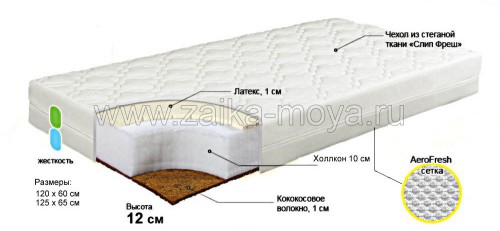 Матрас Принц (холл,лат,кокос) Беспружинный матрас на основе плиты холлкона толщиной 10 см. Плита холлкона используется в матрасе как несущая конструкция. Прослойка кокосового волокна делает одну из сторон матраса более жесткой, слой латекса придает холлкону дополнительную мягкость.