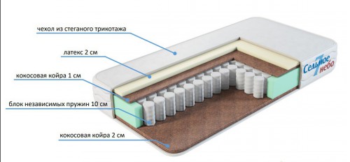 - Сочетание латекса и кокосовой койры увеличивает ортопедичность и анатомичность матраса, создавая мягкость и комфортность;