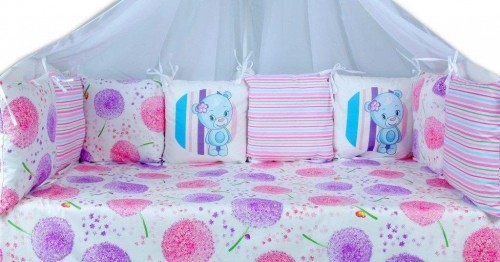 - Комплект изготовлен из высококачественного 100% хлопка и антибактериального, гипоаллергенного, дышащего наполнителя в одеяле, подушке и защитных бортах – холлофайбера.