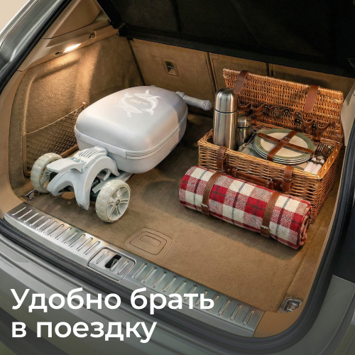 Важнейшей особенностью модели является система быстрого складывания рамы, позволяющая компактно сложить ее всего одним движением руки и взять в руки или положить в багажник автомобиля. Это очень удобно для путешествий, поездок на природу или хранения дома. В комплекте идет легкий и стильный рюкзачок, выполненный из материала EVA. Материал отличается высокой степенью амортизации ударов и обладает малым весом. Размеры рюкзака составляют 29х20х37 см, идеально подходят для перевозки игрушек, сменной обуви или воды. Внутри рюкзака предусмотрено большое отделение с креплением, чтобы все важные вещи не перемещались по ранцу. Есть дополнительный карман на молнии для хранения самого важного.